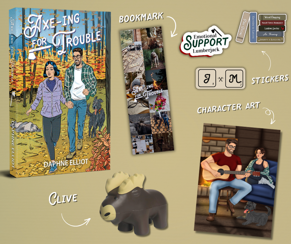 This bundle includes a bookmark, three stickers, character art, Clive the Moose, and the Axe-ing for Trouble paperback.
